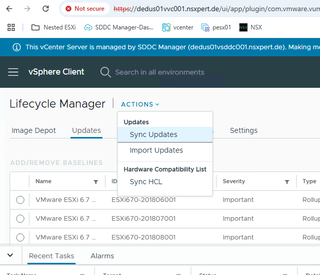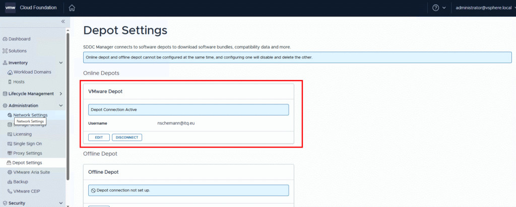 Back in vCenter → Lifecycle Manager, you should now see the updated Depot URLs.
