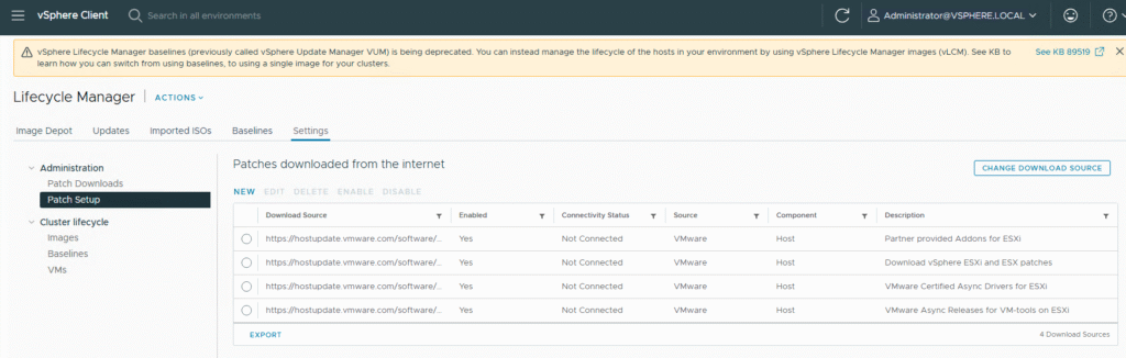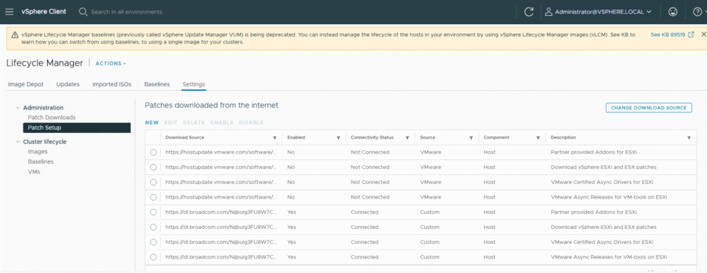 In the Lifecycle Manager view of vCenter, you’ll likely still see the old, now-invalid URLs.
